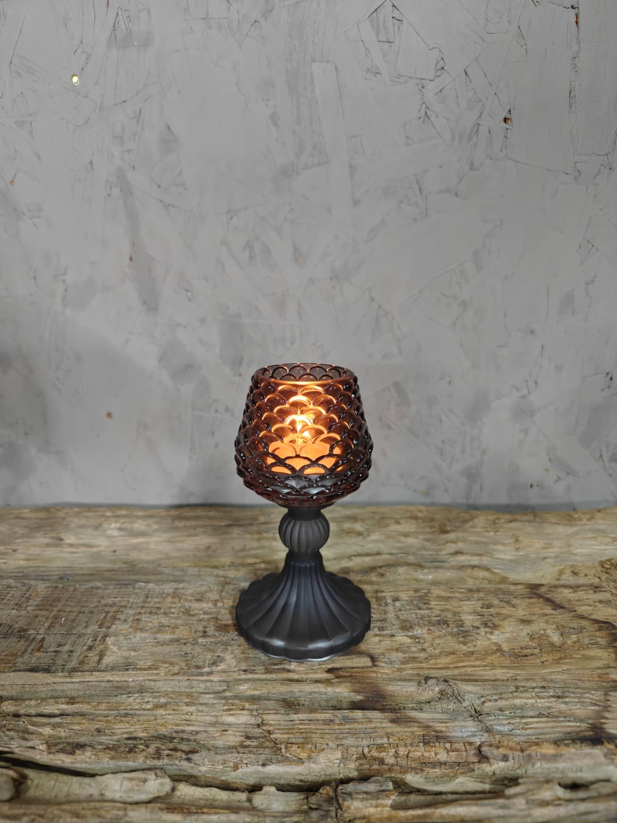 Deze glazen waxinelichthouder zwart klein is perfect voor subtiele maar stijlvolle accenten in huis. Het donkere glas met reliëf verspreidt een warm en sfeervol licht, ideaal voor op een bijzettafel, nachtkastje of in een open kast.