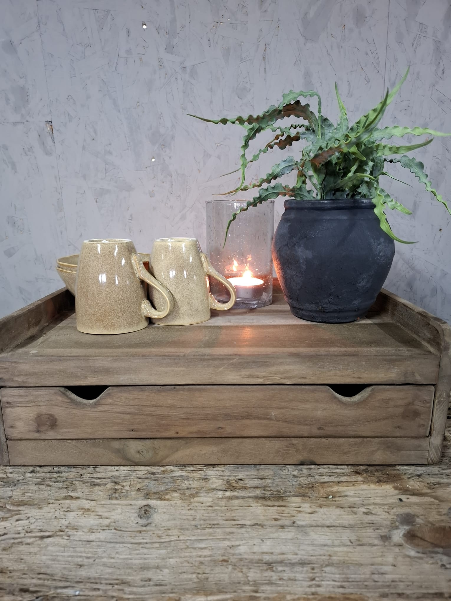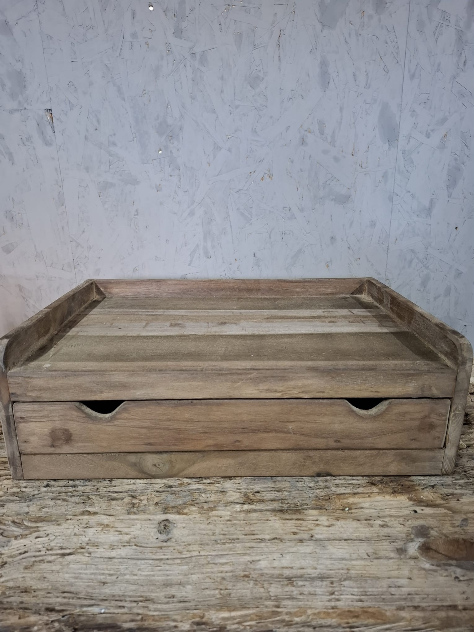 Het Houten Plateau met Lade is een sfeervolle en functionele toevoeging aan jouw interieur. Gemaakt van natuurlijk hout met een warme, doorleefde uitstraling, brengt dit plateau direct sfeer en karakter in huis. De lade biedt extra opbergruimte voor kleine accessoires, servetten of theelichtjes.