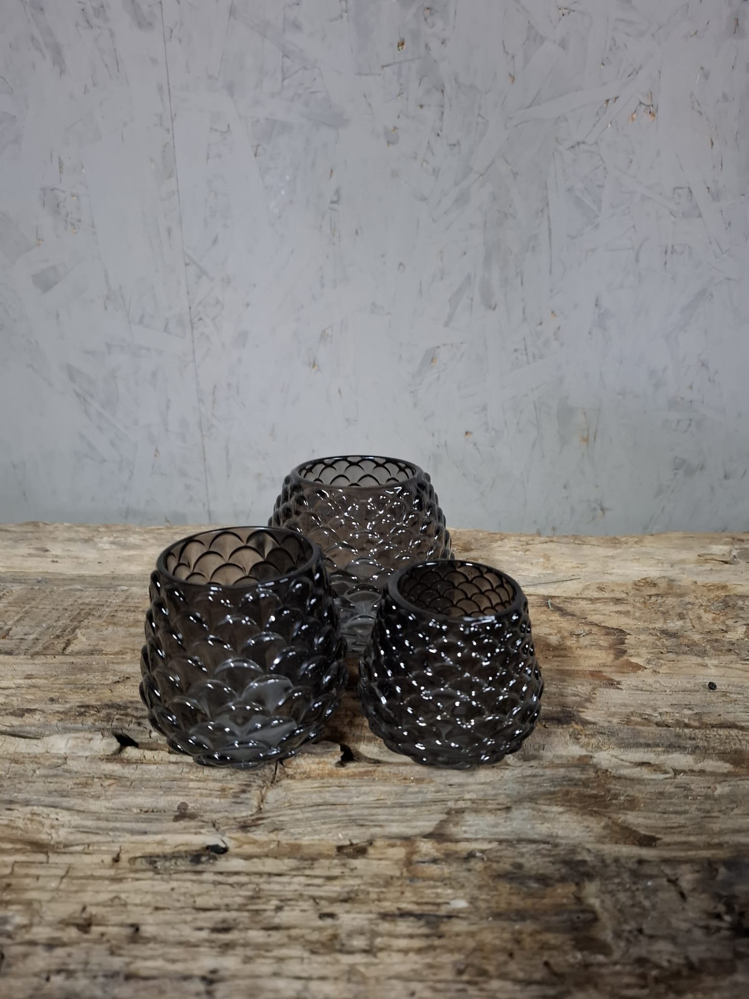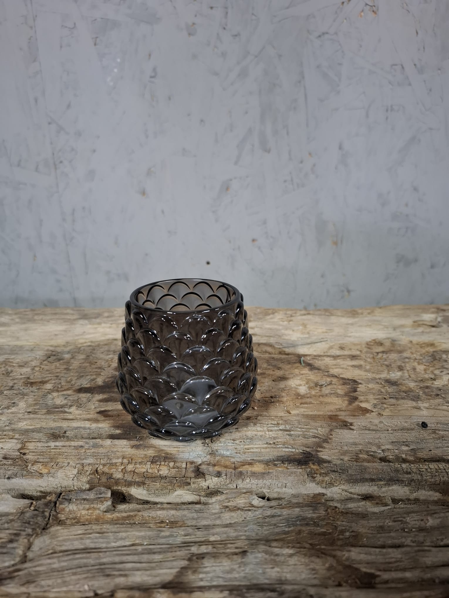De Waxinelichthouder Grijs M heeft een warme grijze kleur. Door de structuur van het glas geeft deze waxinelichthouder prachtig licht.