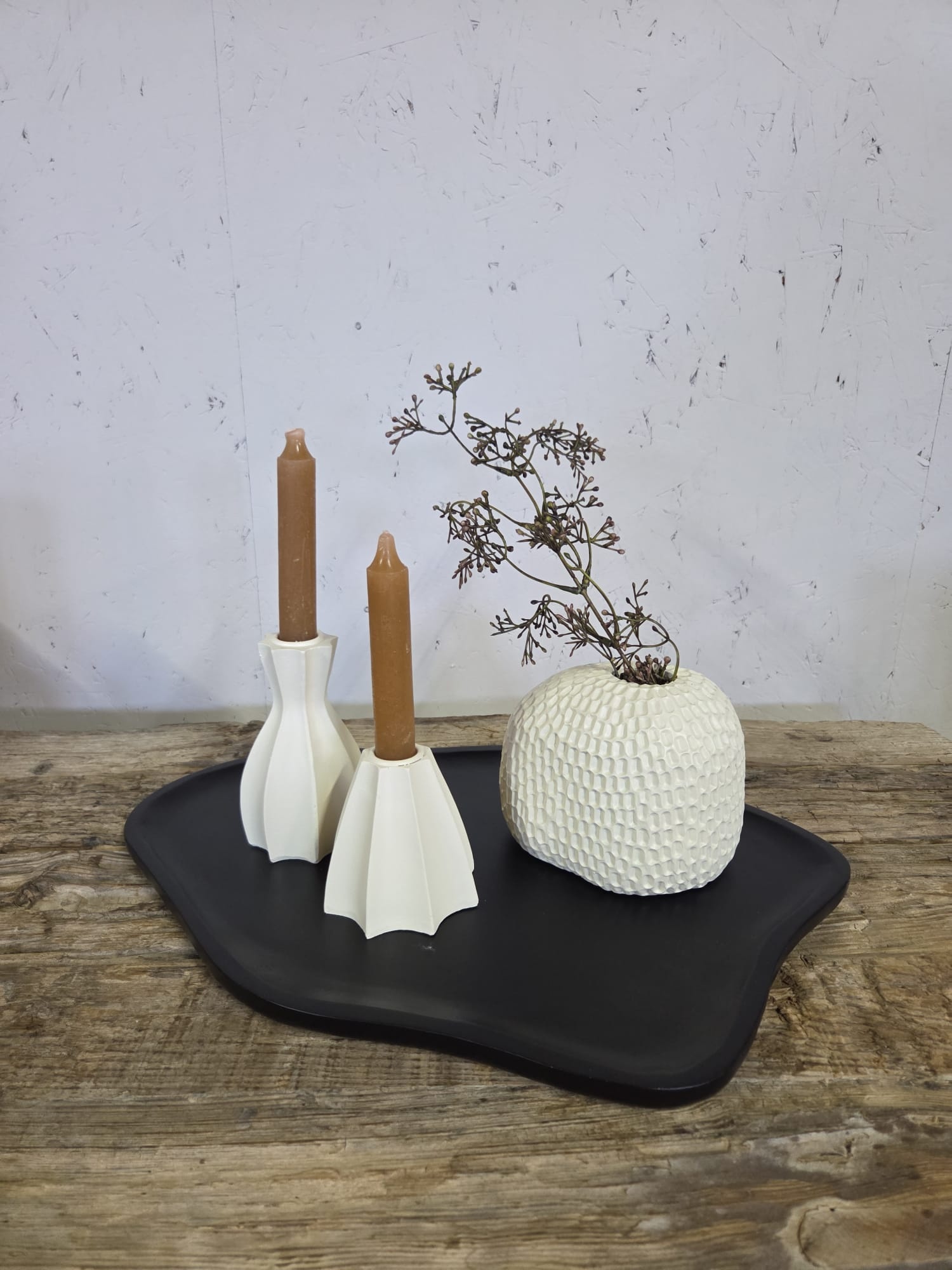 Door het compacte formaat is deze kandelaar ideaal voor kleinere tafels, dienbladen of als onderdeel van een stijlvolle setting met meerdere kandelaars. Perfect voor het creëren van sfeer met een dinerkaars, zonder dat het geheel te druk oogt.