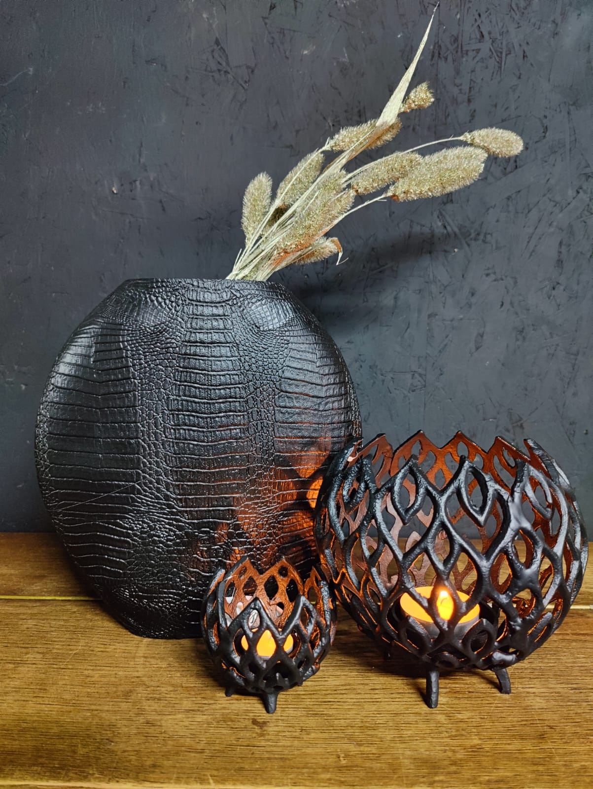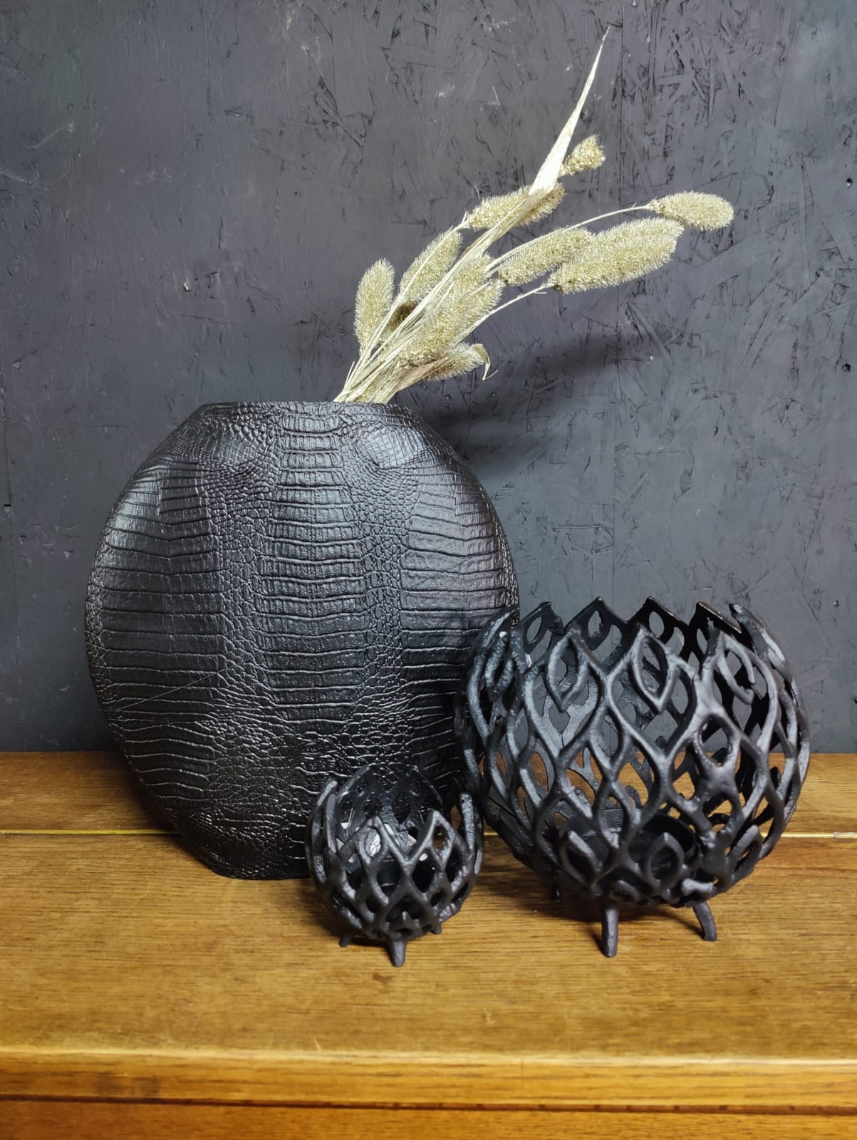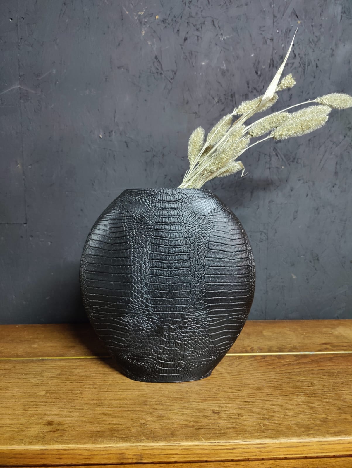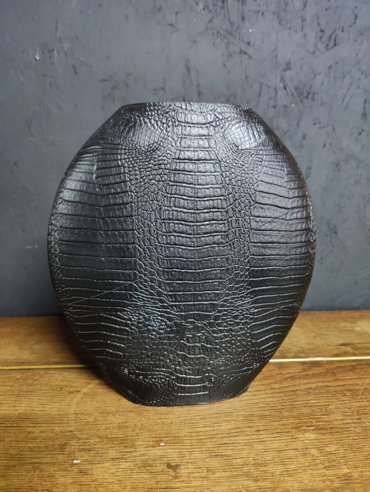 De Zwarte Vaas met Krokodillenstructuur brengt een unieke mix van stoer en stijlvol in je interieur. De matte zwarte kleur en de subtiele krokodillenstructuur geven deze vaas een luxe, moderne uitstraling met een vleugje elegantie.